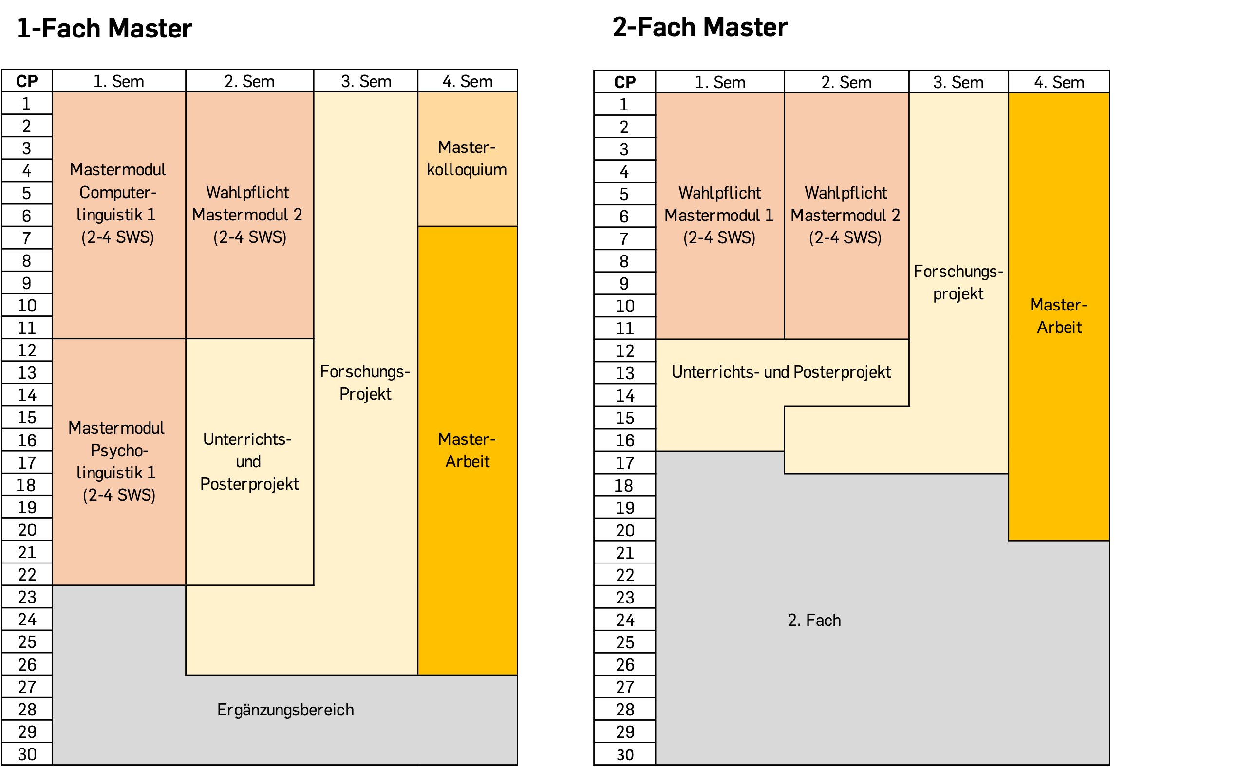 Im 1-Fach-MA belegen Sie im Mastermodul 1 Module aus beiden Bereichen, Computerlinguistik und Psycholinguistik, während Sie im Mastermodul 2 einen der Bereiche als Spezialisierung oder eine interdisziplinäre Ausrichtung des Studiums durch Absolvieren des Moduls Schnittstellen der Computer- und Psycholinguistik wählen. Im 2-Fach-MA studieren Sie von Beginn an nur einen der beiden Bereiche mit je einem Mastermodul 1 und 2 eines Studienfachgebiets. Diese Module zielen darauf ab, für die eigene forschende Arbeit relevante methodische Kenntnisse und Fertigkeiten einzuüben und zu vertiefen. Parallel verankert das Modul Forschungsprojekt Forschendes Lernen fest im Studium: Sie entwickeln und bearbeiten hier eigenständig eine Forschungsfrage. Das Modul Unterrichts- und Posterprojekt vermittelt Ihnen darüber hinaus die Fertigkeit, eigene Forschungsarbeiten sowie Seminarinhalte adressatengerecht zu präsentieren. Im 1-Fach-MA wird dies mit dem Modul Masterkolloquium auf die Präsentation des Forschungsprojekts erweitert.